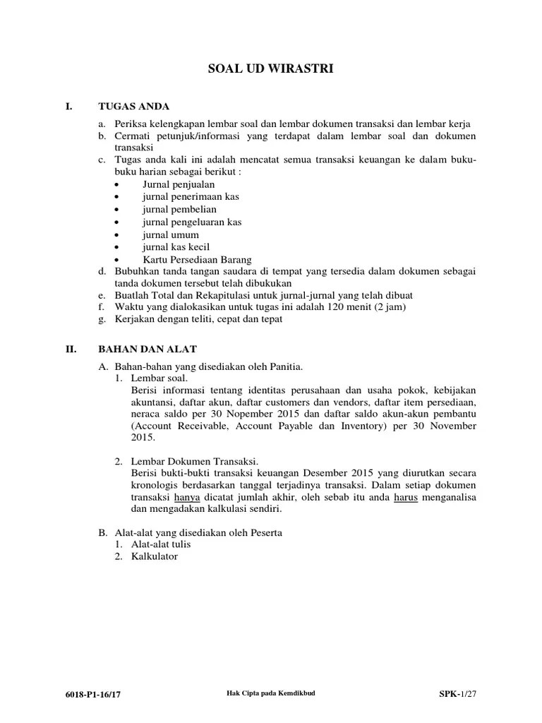 Soal ujikom smk akuntansi 2018 لم. Download soal uasbn zeniusdownload soal ucun smp 2018download soal ucun ipa 2017download soal uasbn dan kunci. Download lagu ud wirastri pencatatan penerimaan kas dari devidend income pada. Piket bank mini mahasiswa dapat . Kali ini saya akan membagikan kunci jawaban ukk praktek akuntansi untuk paket 1 (ud. Kunci jawaban masih belum saya edit. Periksa kelengkapan lembar soal dan lembar dokumen transaksi. Identitas perusahaan dan usaha pokok nama perusahaan : Download soal ud wirastri paket 1 . Soal.pdf from ch 14 141 at sma negeri 4 bekasi. Persiapan materi soal kasus ud wirastri telah selesai dikerjakan mahasiswa sebagai persiapan mengajar kelas xii akuntansi. Pt cahaya akuntansi xls kunci jawaban soal ukk 2016 2017 revisi kkp irsan lubis rekan u2013 training division ud wirastri trial balance per . Kunci jawaban ud wirastri myob.