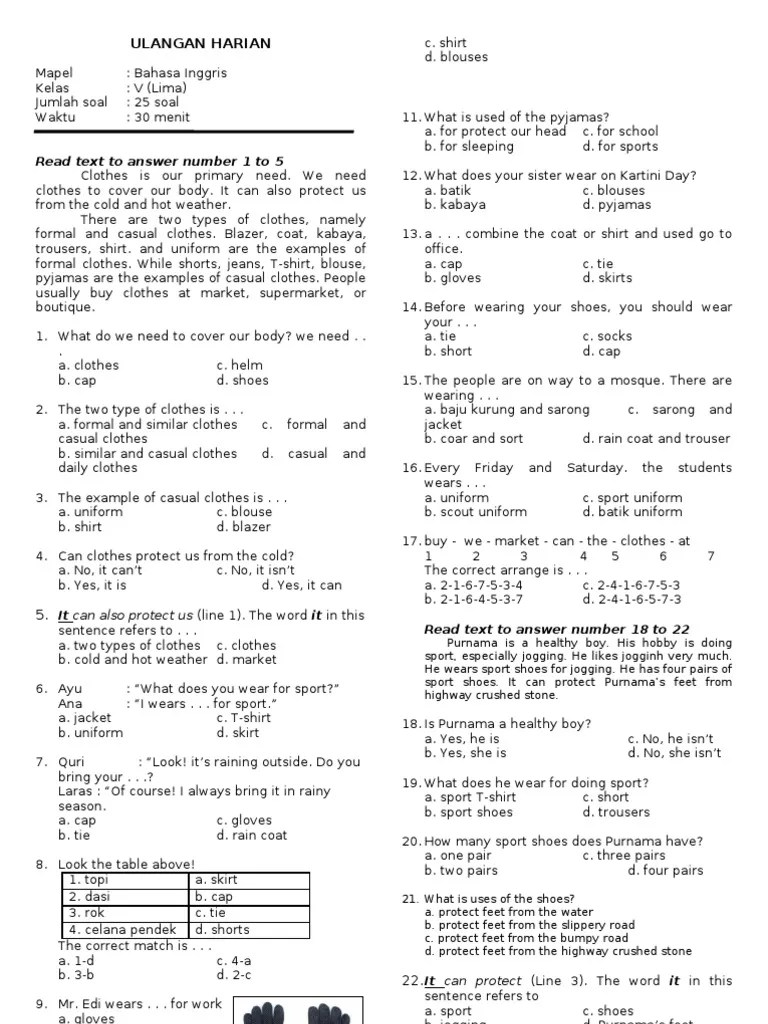 Frida is wearing a pair grey of shoes. Memperbanyak latihan soal bahasa inggris kelas 3 akan sangat membantu dalam. Siswa mampu mempraktikkan pembacaan dialog tentang clothes. Inilah pembahasan soal dan jawaban latihan uas, ukk dan pat untuk siswa kelas 3 sd / mi materi bahasa inggris semester genap. Seragam sekolah dalam bahasa inggris adalah……… a. Silahkan dibaca dan dijawab dengan teliti. Frida is wearing a pair of shoes grey. Can clothes protect us from the cold? Mata, hidung, dan telinga, in . Which one the clothes for sleeping? We put our book in the. Siswa mampu menyanyikan lagu tentang clothes. Where can people buy clothes?